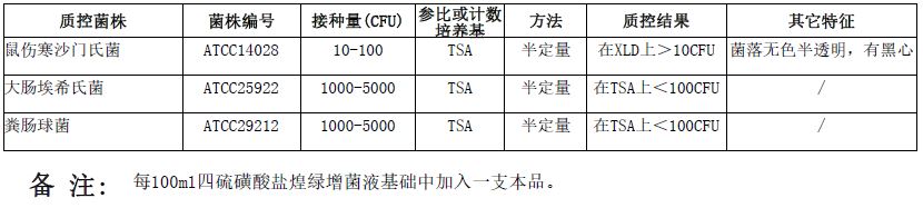 取一支添加于100ml HB4086 四硫磺酸盐煌绿增菌液基础(TTB)或HB4086-3四硫磺酸钠亮绿培养基(TTB)(中国药典)或HB4086-2液体连四硫酸盐培养基(USP标准)中。