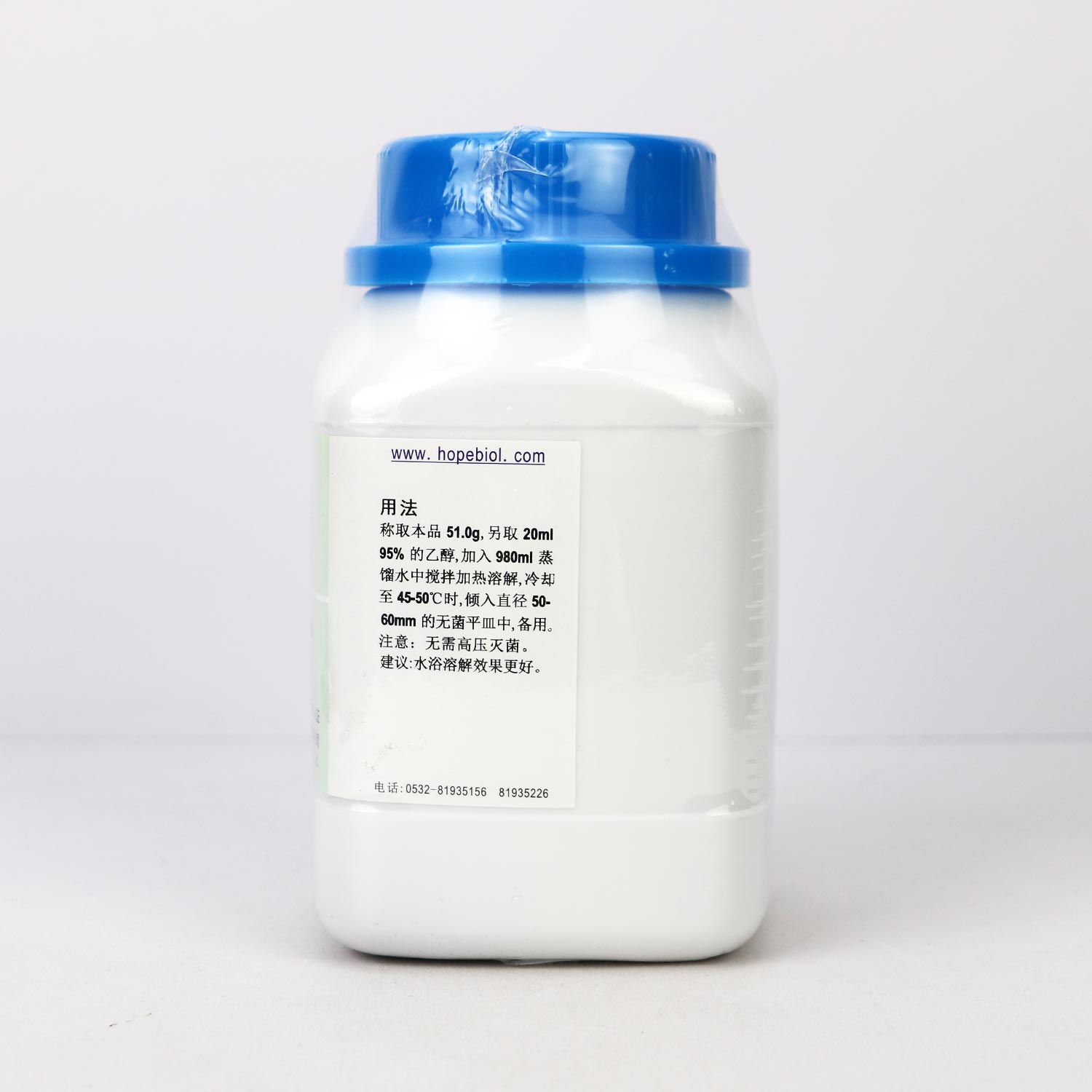 称取本品51.0g,另取20ml 95%的乙醇,加入980ml蒸馏水中搅拌加热溶解,冷却至于45-50℃时,倾入直径50-60mm的无菌平皿中,备用。