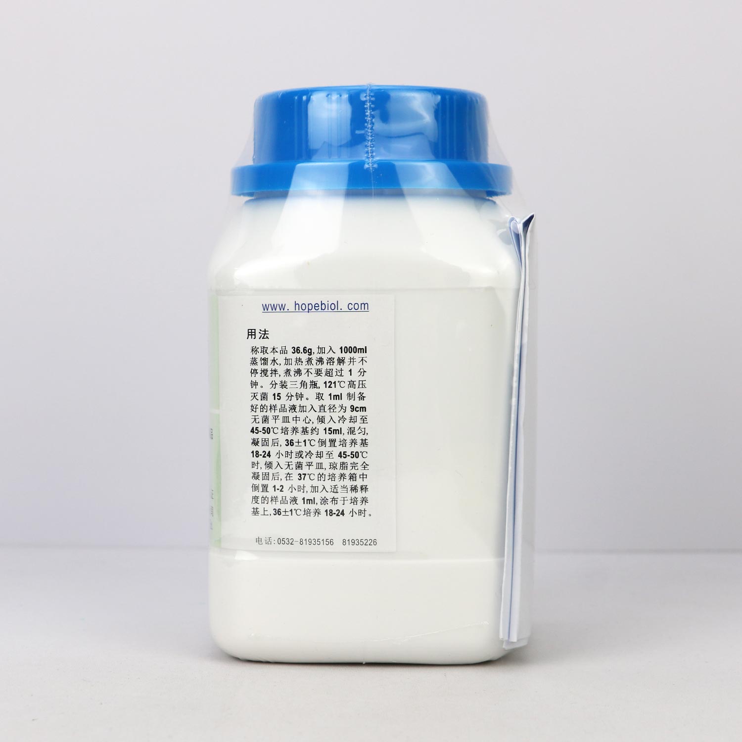 称取本品36.6g,加入1000ml蒸馏水,加热溶解并不停搅拌,煮沸不要超过1分钟。分装三角瓶,121℃高压灭菌15分钟。取1ml制备好的样品液加入直径为9cm无菌平皿中心,倾入冷却至45-50℃培养基约15ml,混匀,凝固后,36±1℃倒置18~24h。