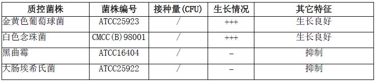 按标签用法制备培养基,接种以下质控菌株,放置36℃需氧培养24-72小时。