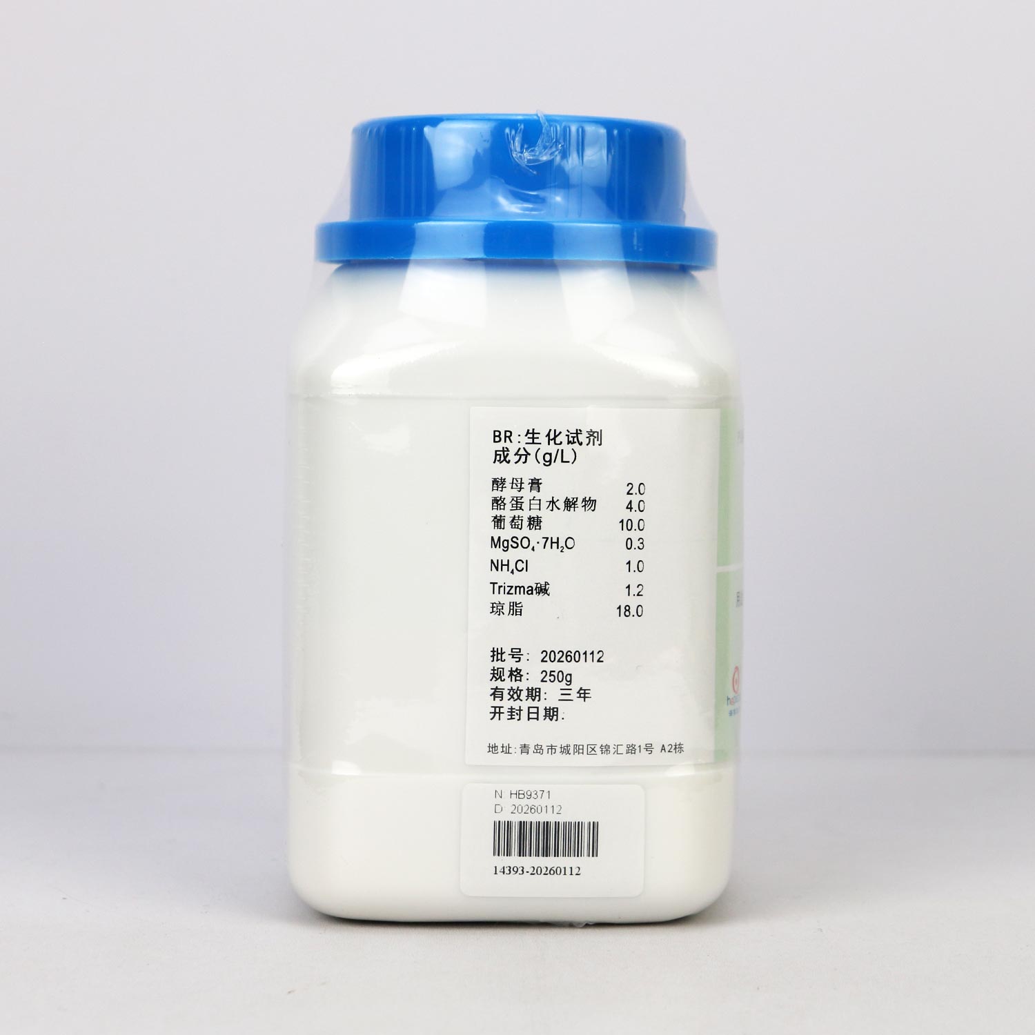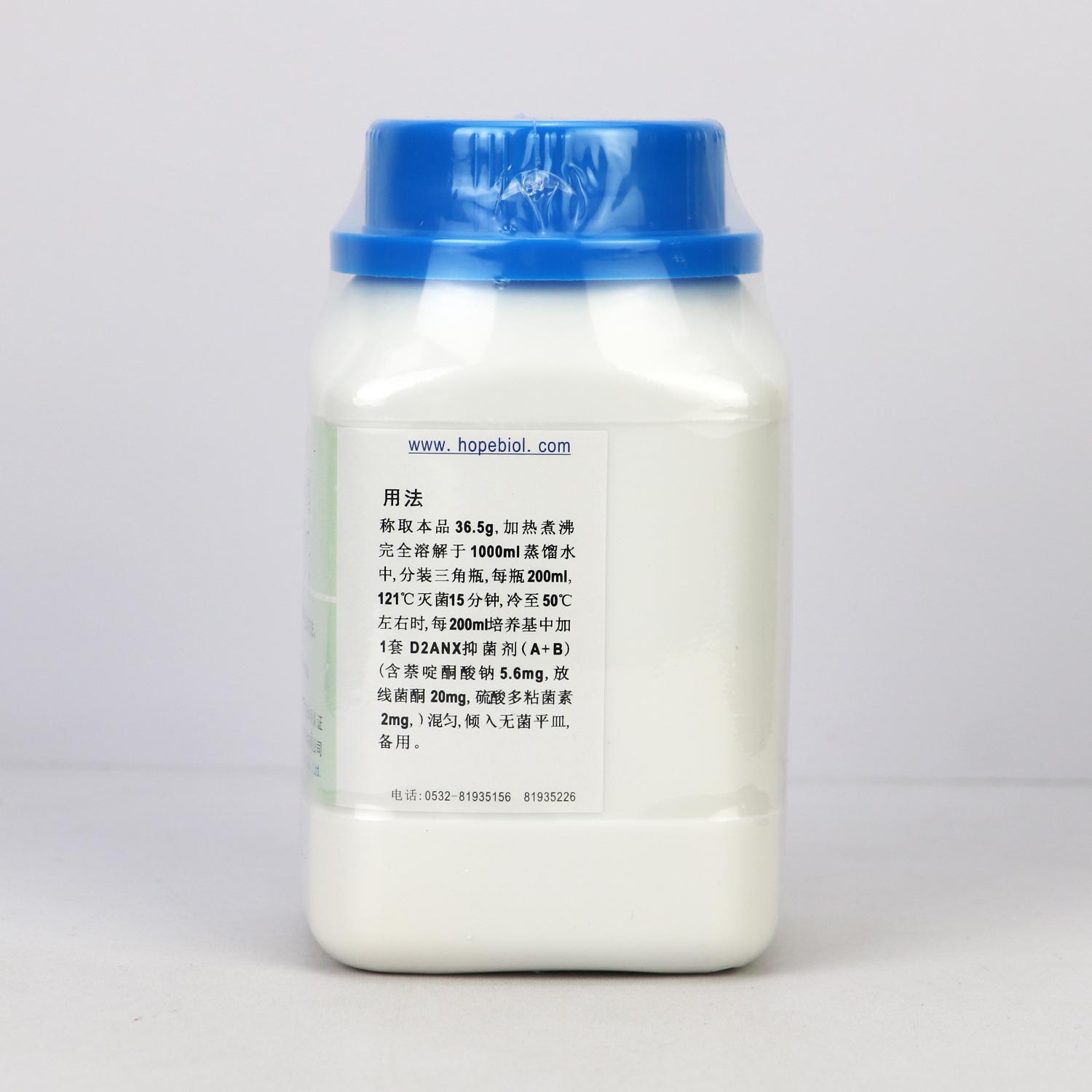 称取本品36.5g,加热煮沸完全溶解于1000ml蒸馏水中,分装三角瓶,每瓶200ml,121℃灭菌15分钟,冷至50℃左右时,每200ml培养基中加1套D2ANX抑菌剂(A+B)(含萘啶酮酸钠5.6mg,放线菌酮20mg,硫酸多粘菌素2mg),混匀,倾入无菌平皿,备用。