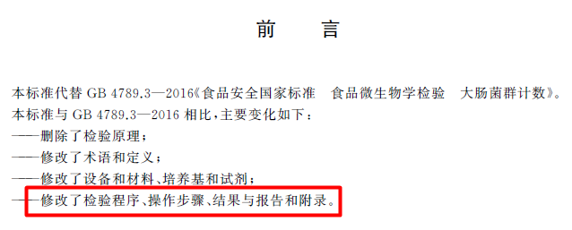 新标准中对检验程序、操作步骤、结果与报告、附录都有修改。