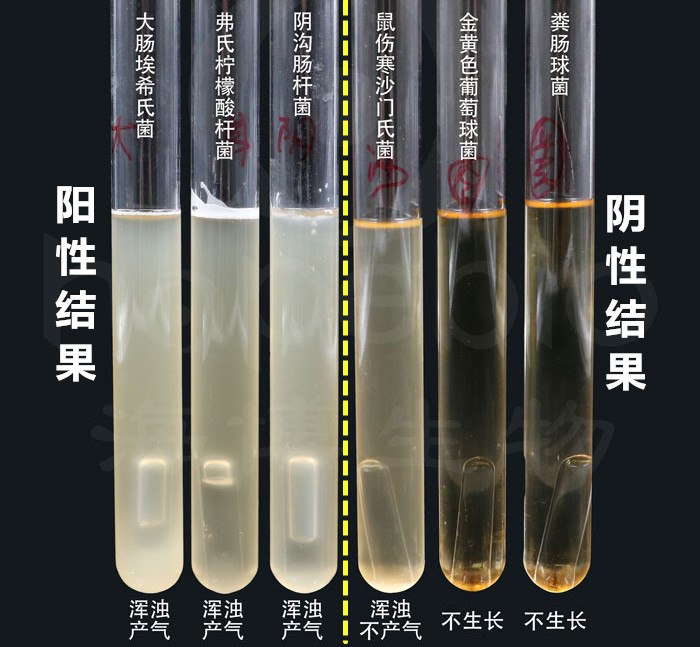 阳性管和阴性管的参考图示如下,菌液浑浊,且小倒管中有气泡的试管,判为阳性。