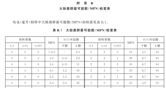 根据复发酵试验中3个适宜连续稀释度中大肠菌群阳性的管数,按照附录B中的MPN 检索表,报告每克(毫升)样品中大肠菌群的MPN 值,以MPN/g(mL)表示。