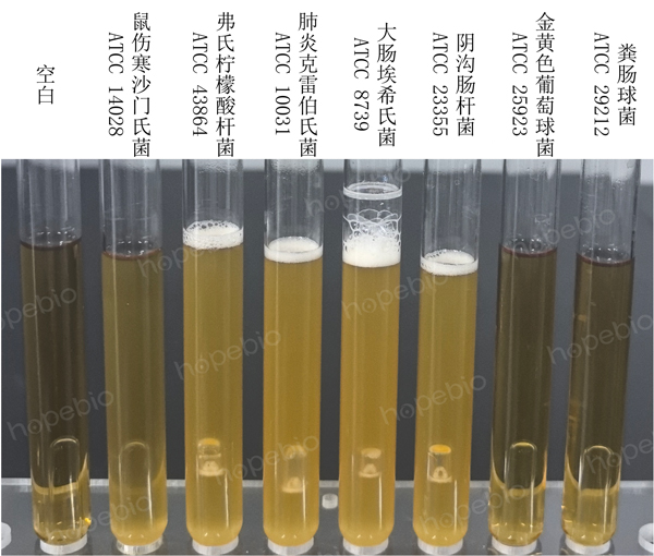 1、称取本品71.2g,加热搅拌溶解于1000mL蒸馏水中,分装到有倒立发酵管的20mm*150mm试管中,每管10mL,121℃高压灭菌15min,备用。