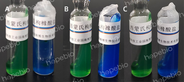 挑取纯化菌落接种于西蒙氏枸橼酸盐培养基,36℃±1℃培养24h,培养基变蓝色为阳性,绿色为阴性。洋葱伯克霍尔德菌为阳性反应,如图7所示。