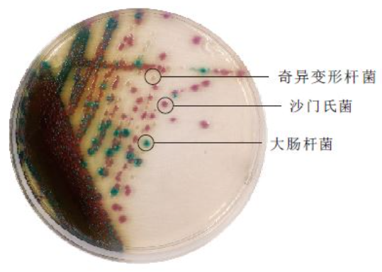 酵母浸粉为细菌生长提供维生素和辅助因子,木糖、乳糖和蔗糖作为可发酵碳源。除志贺氏菌外,其他大多数肠杆菌均发酵木糖,加入赖氨酸是为了鉴别沙门氏菌。沙门氏菌发酵木糖产酸,形成的酸性环境有利于该菌产生脱羧酶,沙门氏菌使赖氨酸脱羧,从而使培养基的pH升高向碱性转变,但这种转变可因其他菌发酵乳糖和蔗糖产生大量的酸而被阻止。在碱性的条件下,硫代硫酸钠及柠檬酸铁铵与沙门氏菌产生的硫化氢反应,使得菌落的颜色呈黑色;但当酸性条件下时,这种反应被抑制。苯酚红作为酸碱指示剂,氯化钠维持体系渗透压平衡,去氧胆酸盐抑制革兰氏阳性菌的生长。