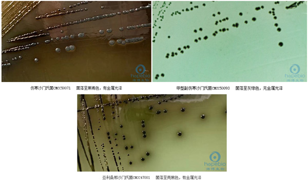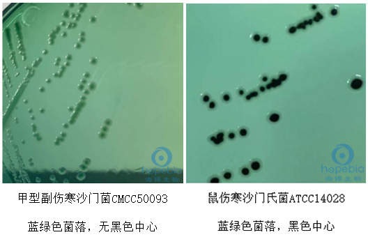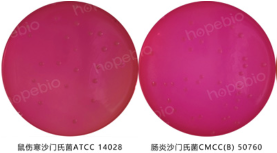 本产品是青岛海博生物技术有限公司改良的培养基,主要用于食品、水、牛奶、冰激凌、肉制品和其它样品中沙门氏菌的显色培养及快速检测。特殊营养物质提供微生物生长所需的碳氮源和微量元素,并维持均衡的渗透压;显色底物是由产色因子和微生物部分可代谢物质组成,在特异性酶作用下,游离出产色因子使菌落显示颜色。在沙门氏菌显色培养基上,沙门氏菌自身代谢产生的酶与相应显色底物反应使菌落显色,其菌落显紫色或紫红色;变形杆菌属、志贺氏菌属等不发酵乳糖的细菌菌落呈无色、白色或灰色;能发酵乳糖的大肠菌群菌落呈蓝色或蓝绿色。