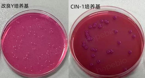 图3:小肠结肠炎耶尔森氏菌在改良培养基和CIN-1培养基上特征性反应