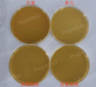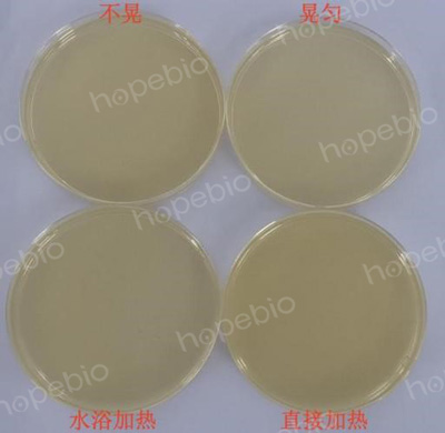 (2)变量条件:灭菌前分别进行不晃动、晃匀(培养基粉末完全溶解)、水浴加热(粉末完全溶解)、直接加热(加热溶解至煮沸)处理。