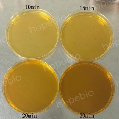 随着灭菌时间延长,SDA和MRS培养基的褐变程度逐渐加深(图5~图8)。10 min灭菌组呈浅黄色(无明显褐变),15 min组为浅棕色,20 min组为棕色,30 min组为深棕色。其中,SDA培养基在10~15 min阶段褐变程度变化较小,20 min后显著加剧;MRS培养基在15 min后褐变速率明显加快,30 min组褐变最为严重。这说明灭菌时间与美拉德反应呈正相关,延长灭菌时间会直接增加反应持续时间,导致营养成分消耗增多,褐变程度加剧。但《GB 4789.28-2024》中规定了SDA与MRS的灭菌时间为15 min,灭菌10 min时虽褐变程度较小,但因不符合国家标准而不具备适用性。