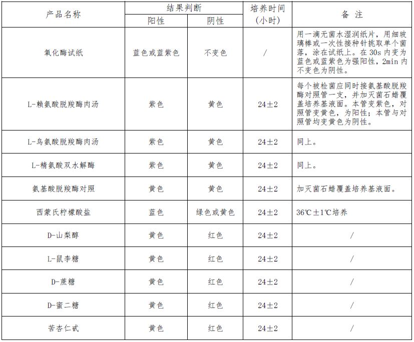 取TSA平板上直接挑取黄色可疑菌落进行氧化酶试验并分别接种赖氨酸脱羧酶肉汤、鸟氨酸脱羧酶肉汤、L-精氨酸双水解酶、氨酸脱羧酶对照、西蒙氏柠檬酸盐、D-山梨醇、L-鼠李糖、D-蔗糖、D-蜜二糖、苦杏仁甙。请参照GB/T4789.40标准判断结果。