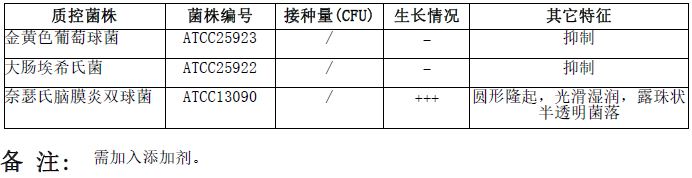 按标签用法制备培养基,接种以下质控菌株,放置36±1℃需氧培养18-24小时。