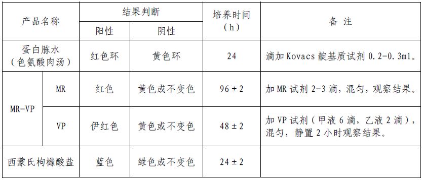 | 注:如出现上表以外的生化反应类型,表明培养物可能不纯,需重新划线分离,必要时做重复试验。 | ||||
