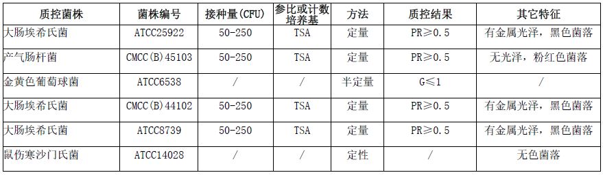 按标签用法制备培养基,接种以下质控菌株,放置36±1℃需氧培养18-24小时。
