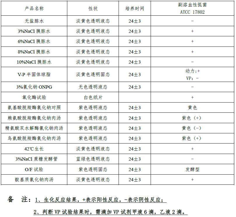 无盐胨水、3%NaCl胰胨水、6%NaCl胰胨水、8%NaCl胰胨水、10%NaCl胰胨水、V-P半固体琼脂、赖氨酸脱羧酶氯化钠肉汤、精氨双水解酶氯化钠肉汤、氨基酸脱羧酶氯化钠肉汤对照、鸟氨酸脱羧酶氯化钠肉汤、3%NaCl ONPG、靛基质氯化钠肉汤、O/F试验、3%NaCl蔗糖发酵管、42℃生长、氧化酶试验。