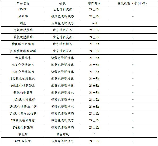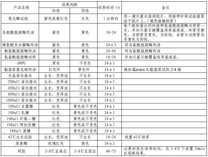 ONPG、尿素酶、明胶、精氨酸双水解酶肉汤、鸟氨酸脱羧酶肉汤、赖氨酸脱羧酶肉汤、氨基酸脱羧酶对照、无盐蛋白胨水、2%氯化钠蛋白胨水、6%氯化钠蛋白胨水、8%氯化钠蛋白胨水、10%氯化钠蛋白胨水、靛基质氯化钠肉汤、1%氯化钠甘露糖、1%氯化钠乳糖、1%氯化钠纤维二糖、1%氯化钠阿拉伯糖、1%氯化钠蔗糖、42℃生长试验、氧化酶试纸。