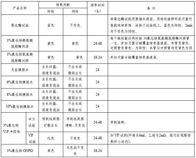 氧化酶试验、3%氯化钠赖氨酸脱羧酶、3%氯化钠氨基酸脱羧酶对照、盐胰胨水、6%氯化钠胰胨水、8%氯化钠胰胨水、10%氯化钠胰胨水、3%氯化钠V-P半固体、3%氯化钠ONPG。