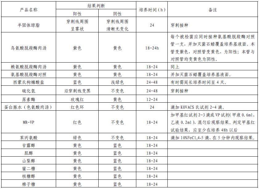 以接种针取试验培养物,分别接种到以下培养基:半固体琼脂,鸟氨酸脱羧酶肉汤,赖氨酸脱羧酶肉汤,氨基酸脱羧酶对照,西蒙氏枸橼酸盐,硫化氢,尿素酶,蛋白胨水(色氨酸肉汤),MR-VP(2支),苯丙氨酸,甘露醇,肌醇,山梨醇,蜜二糖,核糖醇(侧金盏花醇),棉子糖。