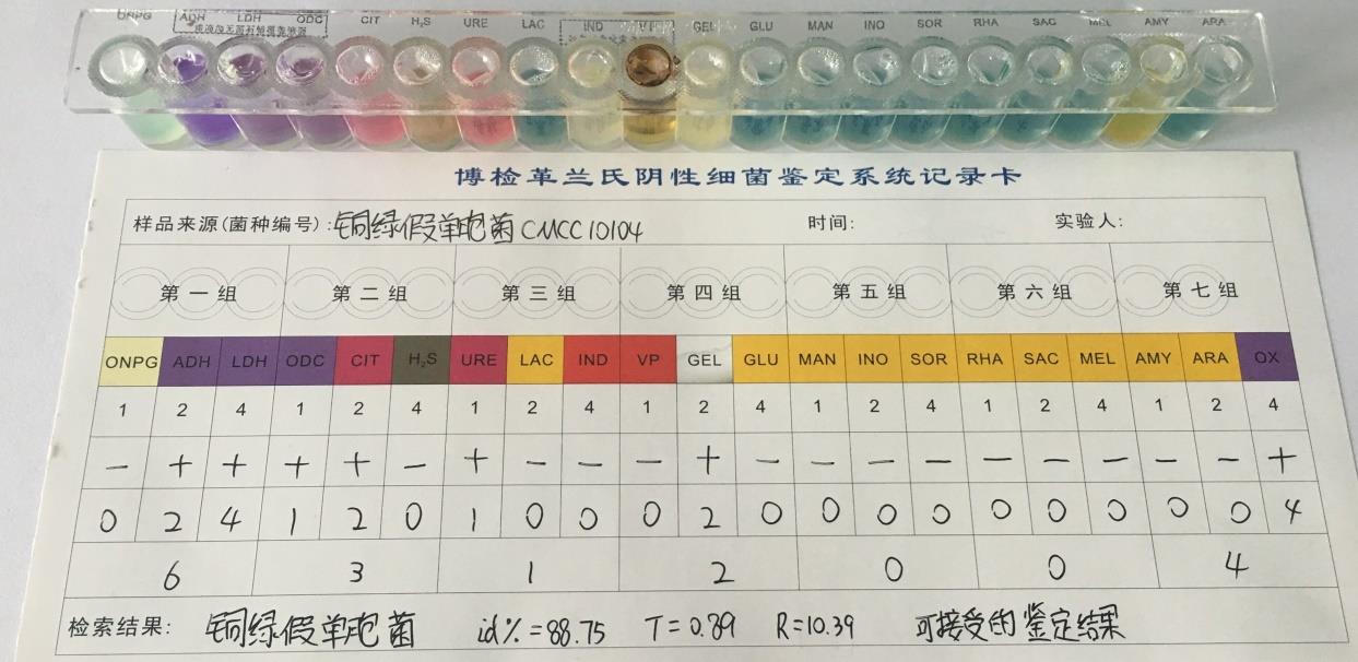 5.博检革兰氏阴性细菌鉴定系统生化检测:铜绿假单胞菌。
