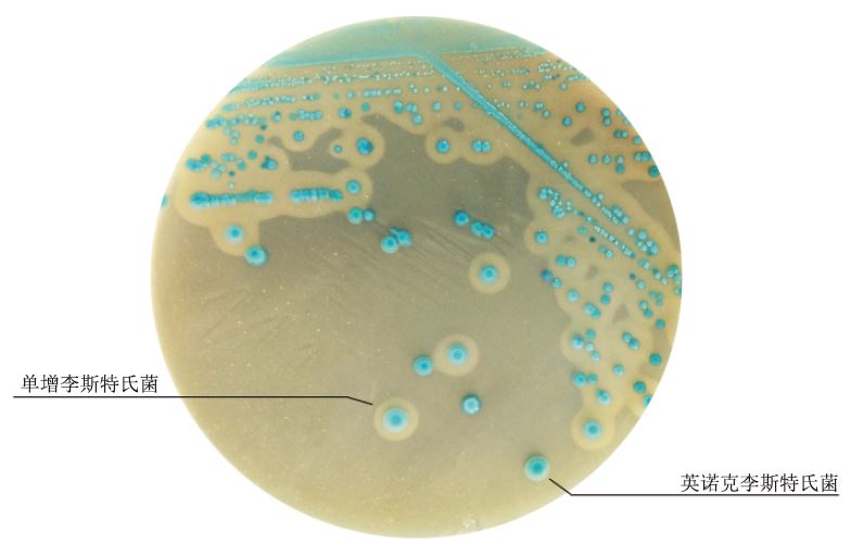 单增李斯特氏菌36℃±1℃培养24-48小时,平板上出现蓝色菌落,菌落周围有一不透明环。伊氏李斯特氏菌36℃±1℃培养48小时,平板上出现蓝色菌落,菌落周围有一不透明环。英诺克李斯特氏菌36℃±1℃培养24-48小时,平板上出现蓝色菌落,菌落周围没有不透明环。在食品检测中伊氏李斯特氏菌非常少见。