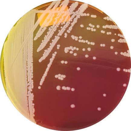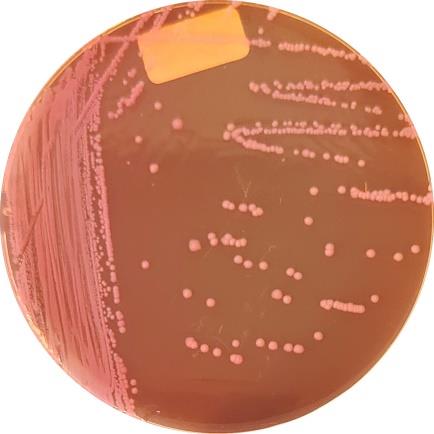 麦康凯琼脂平板:浅黄褐色圆形菌落,表面光滑,周围培养基通常因产碱变为橙黄色(如图1-B)。