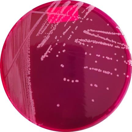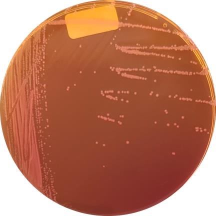 麦康凯琼脂平板:浅黄褐色圆形菌落,表面光滑,周围培养基通常因产碱变为橙黄色(如图1-B)。