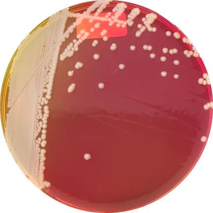 麦康凯琼脂平板:浅黄褐色圆形菌落,表面光滑,周围培养基通常因产碱变为橙黄色(如图1-B)。